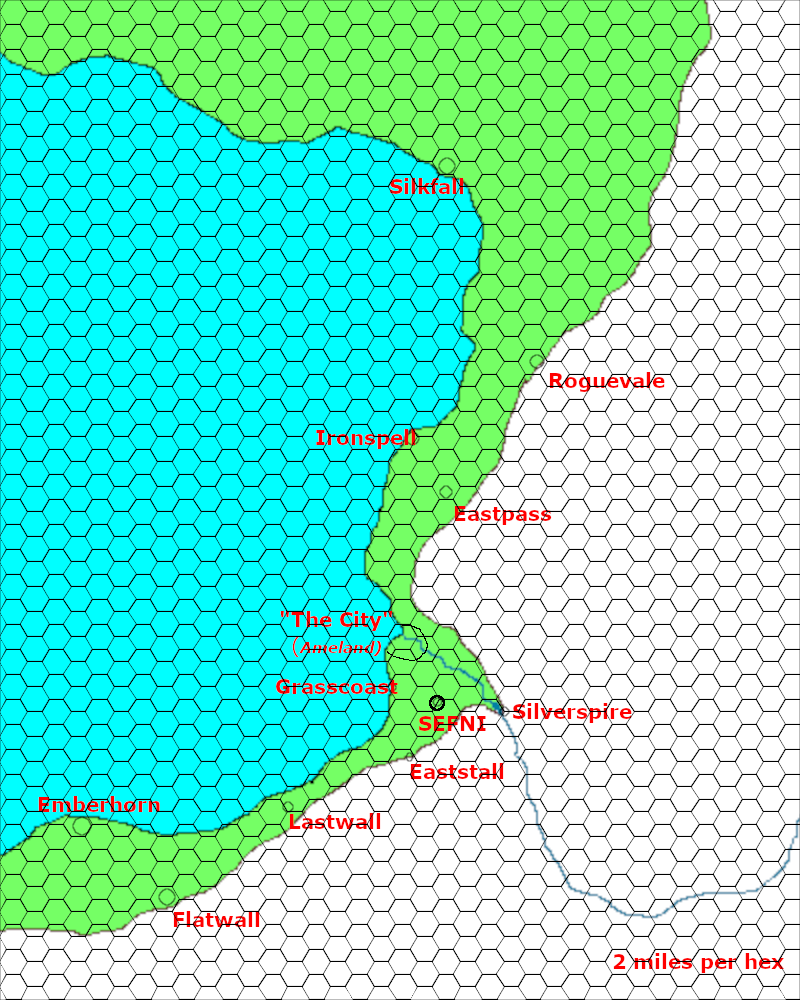 Near Sefni are the ruins of a large, ancient city that thrived in the second age before the “end of the world”. A river runs through it, and a massive waterfall (and small lake) are adjacent. Due to a series of unfortunate incidents soon after settlement, this ruined city is considered cursed by most of the locals. (Some monster lairs, dungeons, and actual magical effects reinforce this notion). While the original city’s name was “Ameland” (pronounced A-muh-lund), that name is known to only a handful of scholars, and most of the new residents simply call it “The City”.